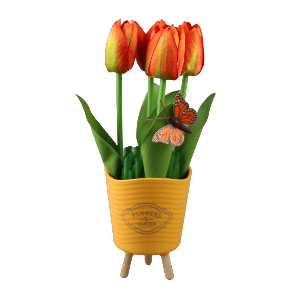 Aranjament floral in ghiveci plastic „Flowers & Garden”, cu lalele si fluture, portocaliu