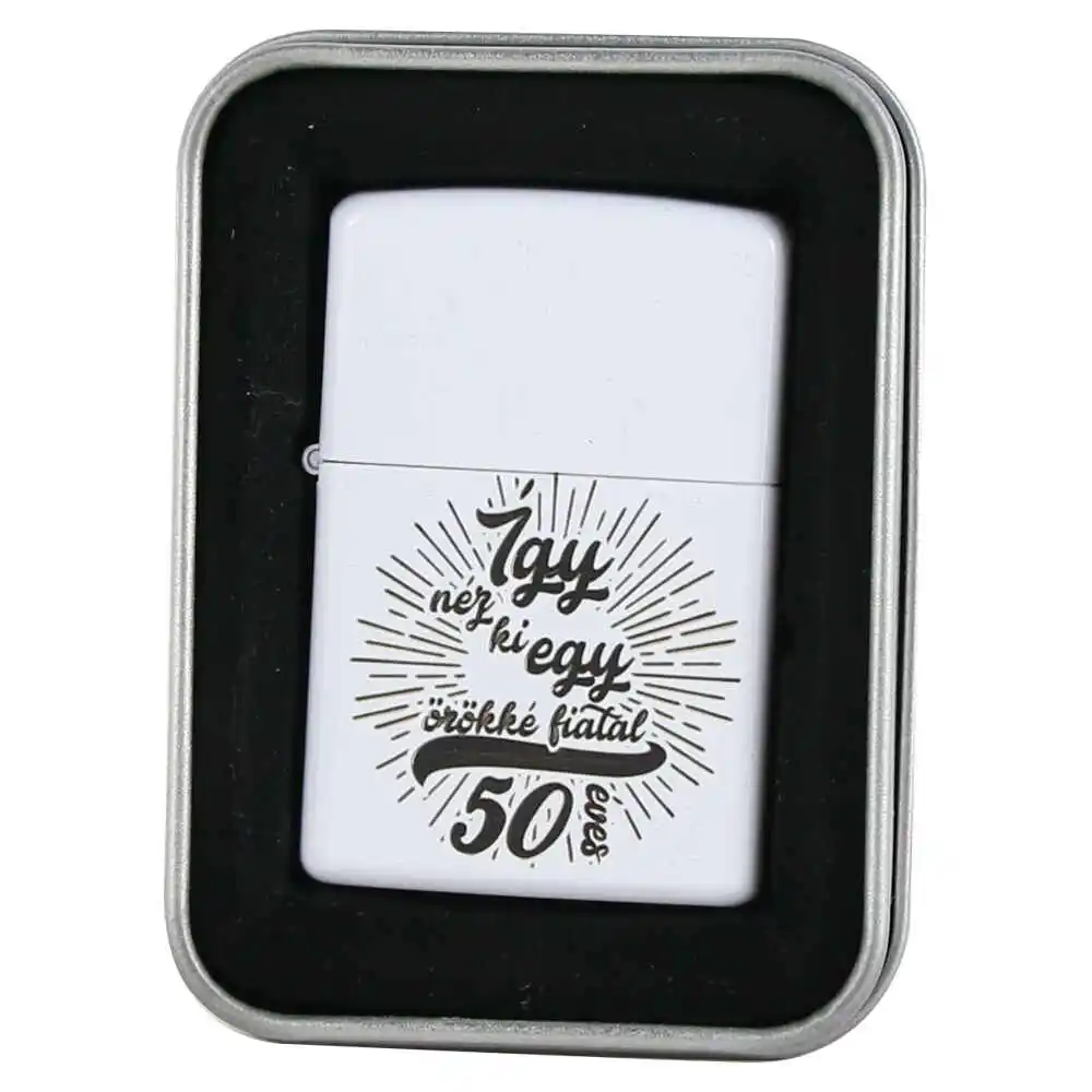 Bricheta metalica „Igy nez ki egy orokke fiatal 50 eves”, 3.5×5 CM, Alb