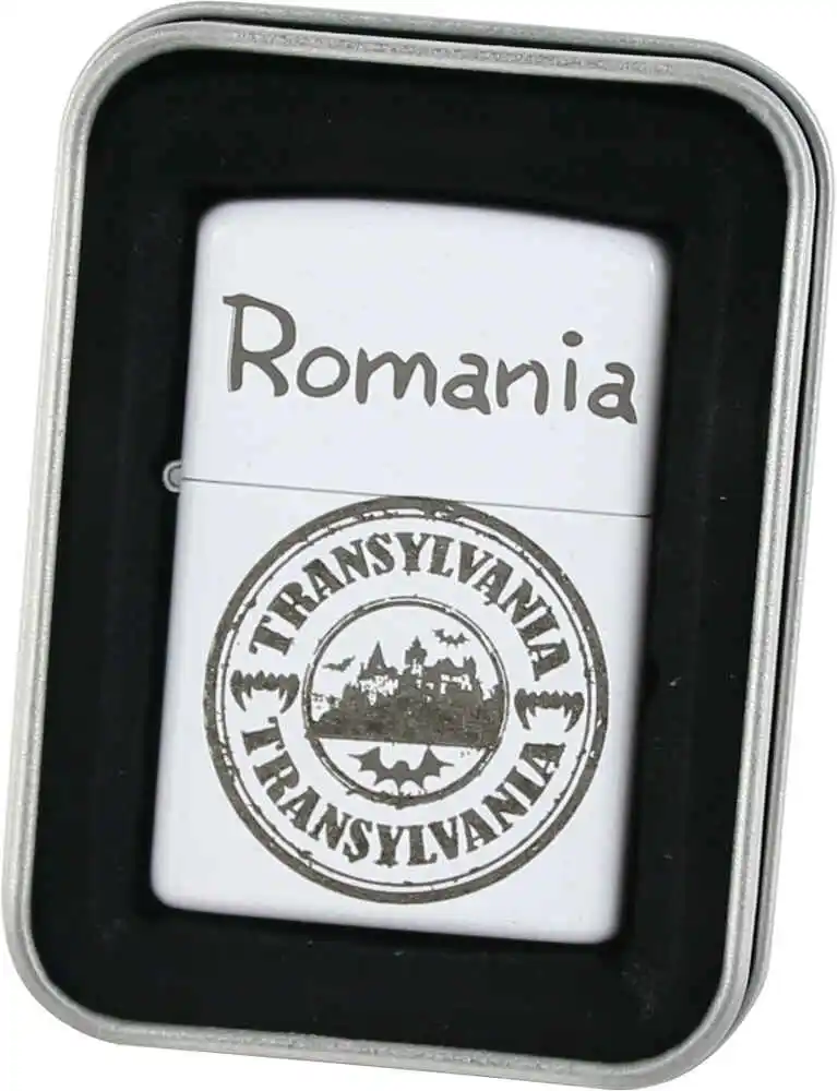 Bricheta metalica „Romania/Transylvania”, 3×5 CM, alb