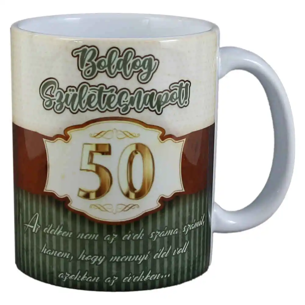Cana ceramica „50 Boldog Szuletesnapot!”, 330 ml, verde/maro