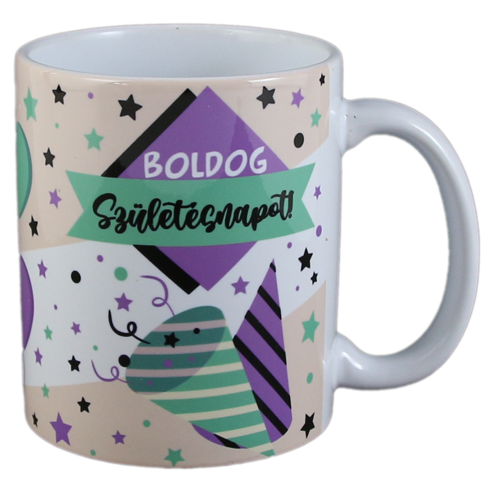 Cana ceramica „Boldog Szuletesnapot”, 330 ml, mov/verde