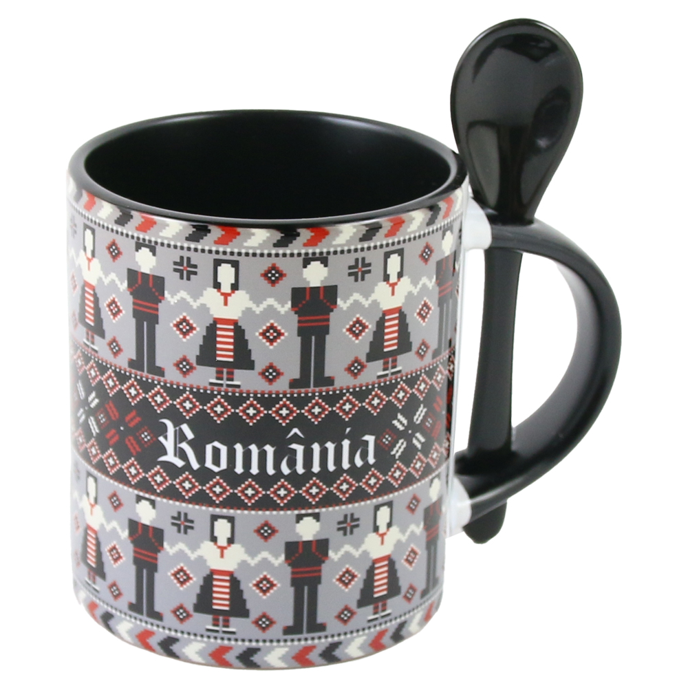 Cana ceramica cu lingurita, „Romania”, 330 ml, dansatori, negru