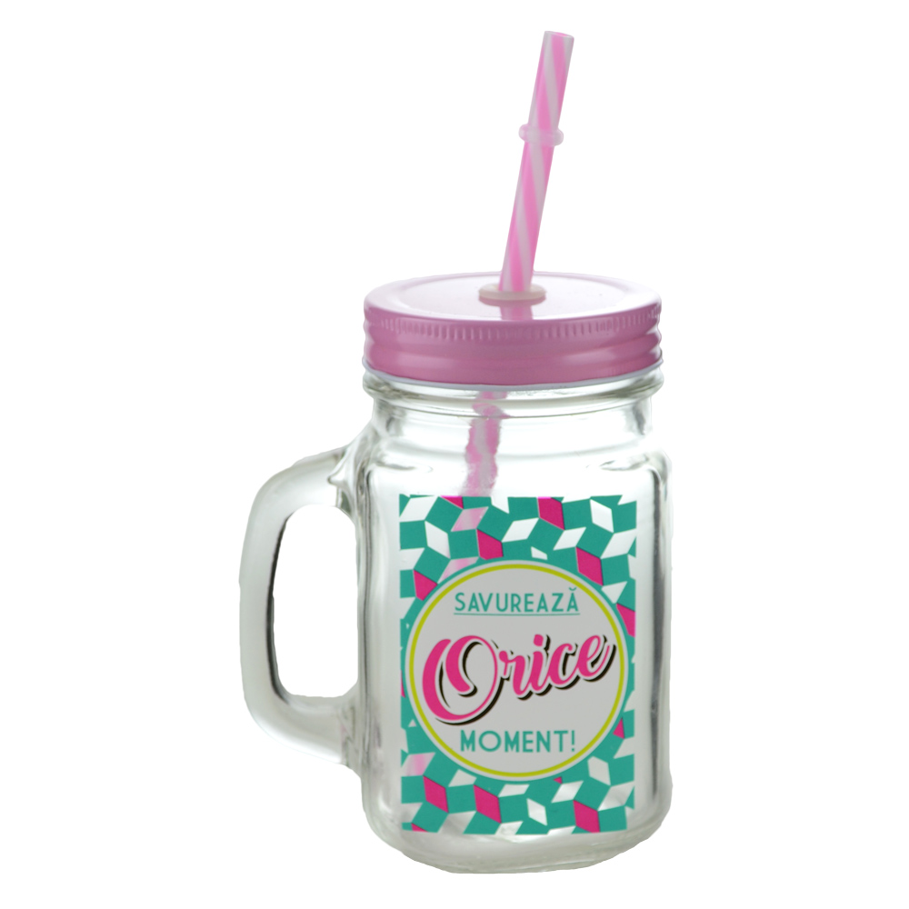 Aceasta cana tip borcan realizata din sticla cu capac si pai este un accesoriu ideal pentru petrecerile realizate alaturi de prietenii dumneavoastra. Textul inscriptionat pe aceasta cana si anume „Savureaza orice moment” insufla un sentiment de distractie