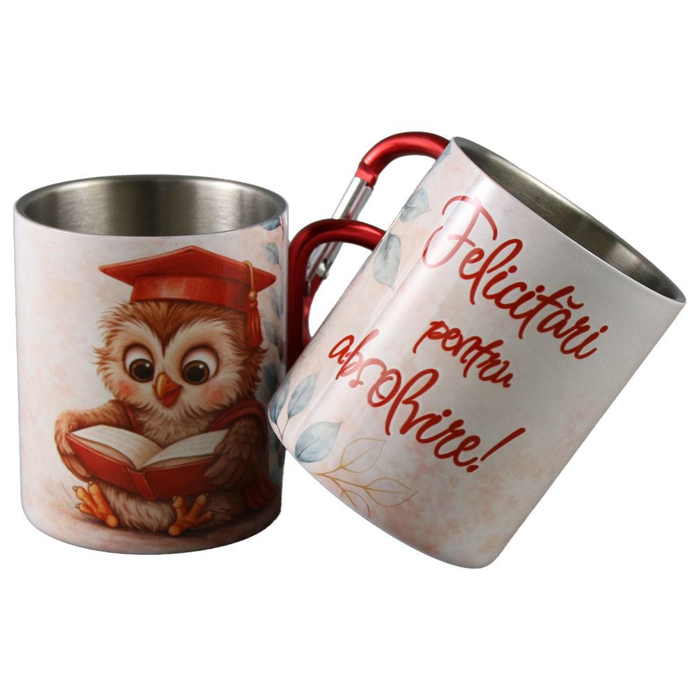 Cana metalica cu carabina „Felicitari pentru Absolvire!” 240 ml, Bufnita rosie