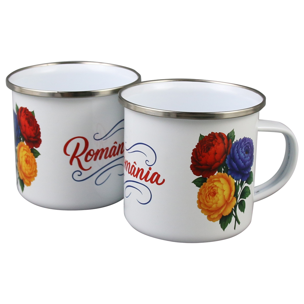 Cana metalica emailata 240 ml, Romania, Bujor tricolor