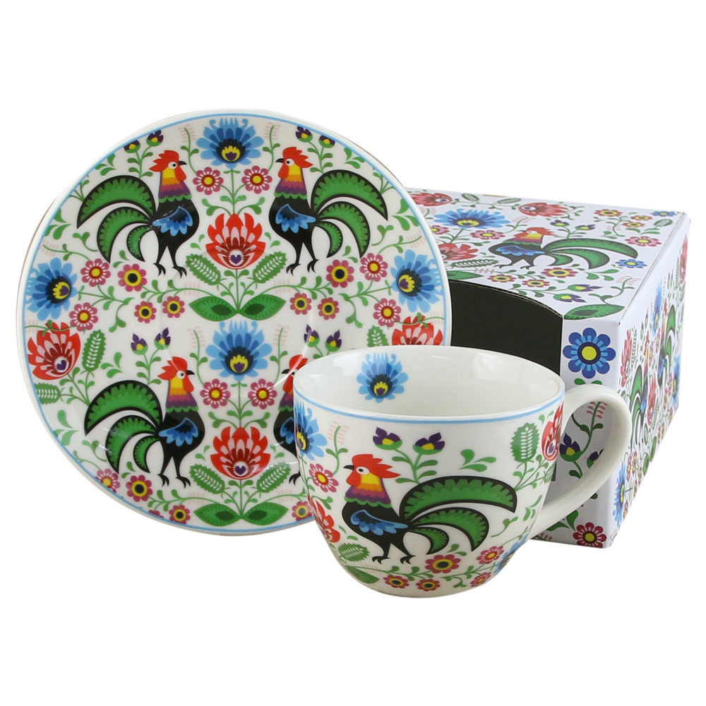Cana portelan cu farfurie 250 ml, „Folk Roosters”, in cutie decorativa