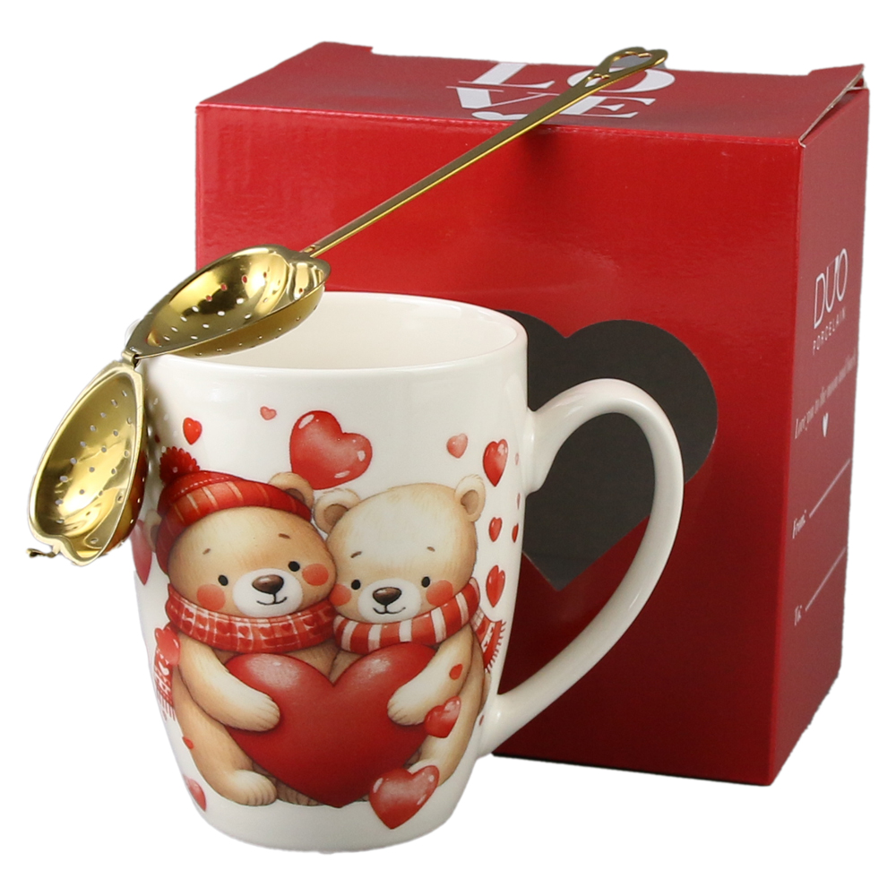 Cana portelan cu infuzor metalic inima, 360 ml, Ursuleti cu inima, cu cutie cadou