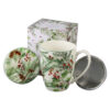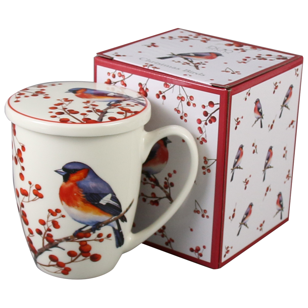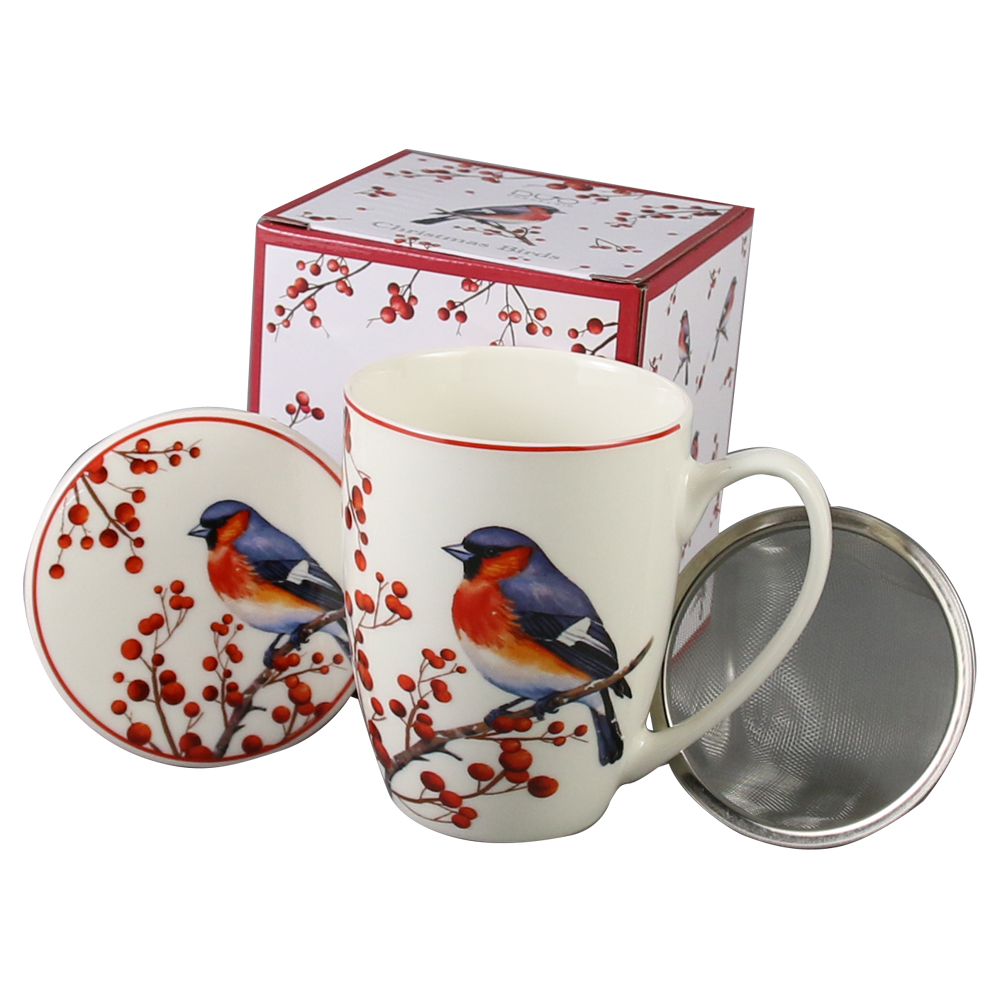 Cana portelan cu infuzor metalic si capac, Christmas Birds, 360 ml, in cutie decorativa, Pasari de Craciun