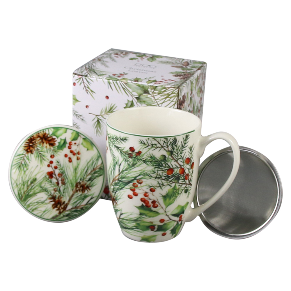 Cana portelan cu infuzor metalic si capac, Christmas Leaves, 360 ml, in cutie decorativa, Frunze de Craciun