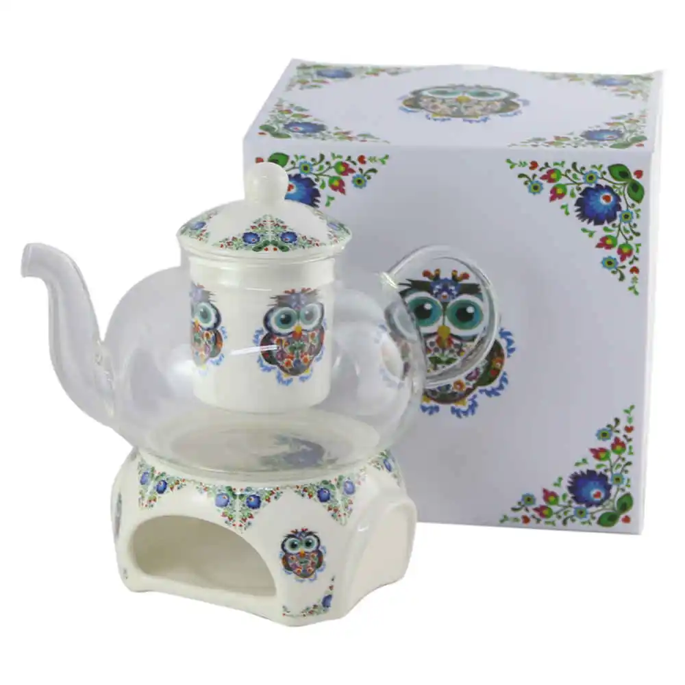 Ceainic cu infuzor, capac si suport 1000 ml, din sticla si portelan „Etno Bufnita” in cutie decorativa