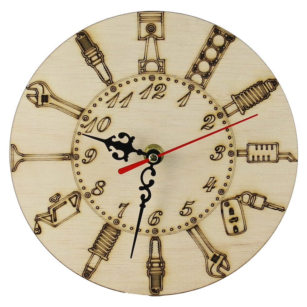 Ceas gravat din lemn 19 CM, Mecanic Auto