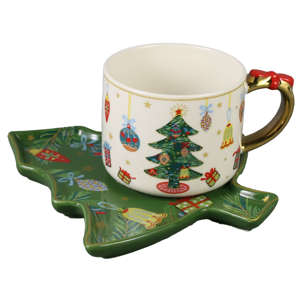 Ceasca cu farfurie din portelan, Around Christmas Tree, 250 ml, in cutie decorativa, Brad de Craciun