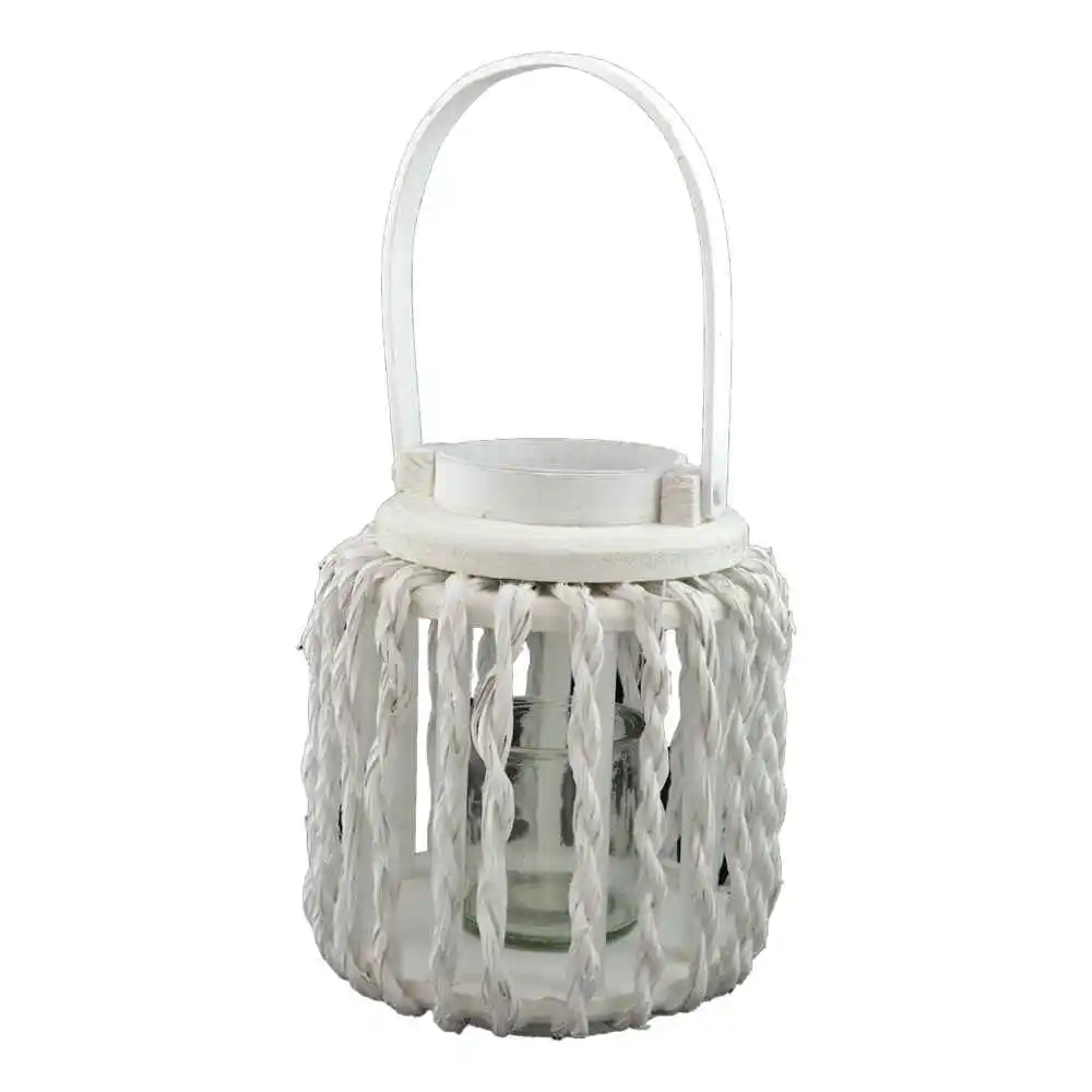 Respectivul felinar cu maner este realizat din ratan. vopsit in alb. dispune de o candela realizata din sticla pentru lumanari tip pastila. ideal pentru a completa decoratiunea interiorului. creand astfel o atmosfera relaxanta. deasemenea putand fi folosi