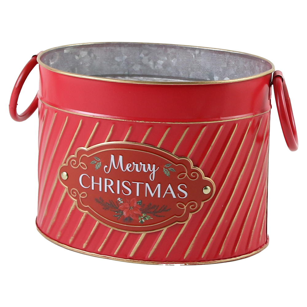 Ghiveci oval din metal „Merry Christmas”, 18×14 CM, rosu/aur