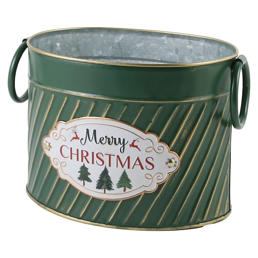 Ghiveci oval din metal „Merry Christmas”, 18×14 CM, verde/aur