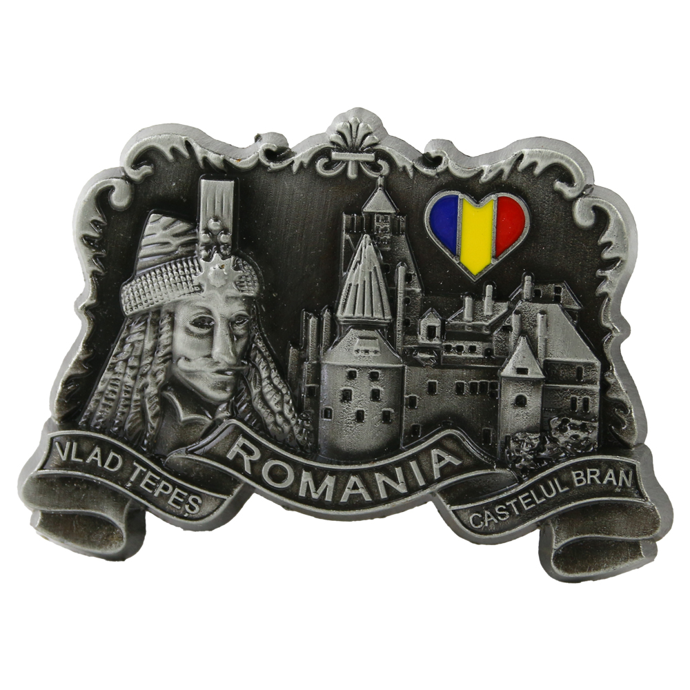 Magnet de frigider metalic 8.5 x 6 cm, Romania/Vlad Tepes & Castelul Bran