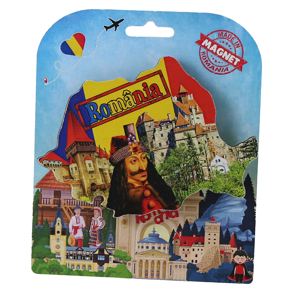 Magnet decorativ Harta Romaniei din lemn 10×7 CM, Vlad Tepes, tricolor