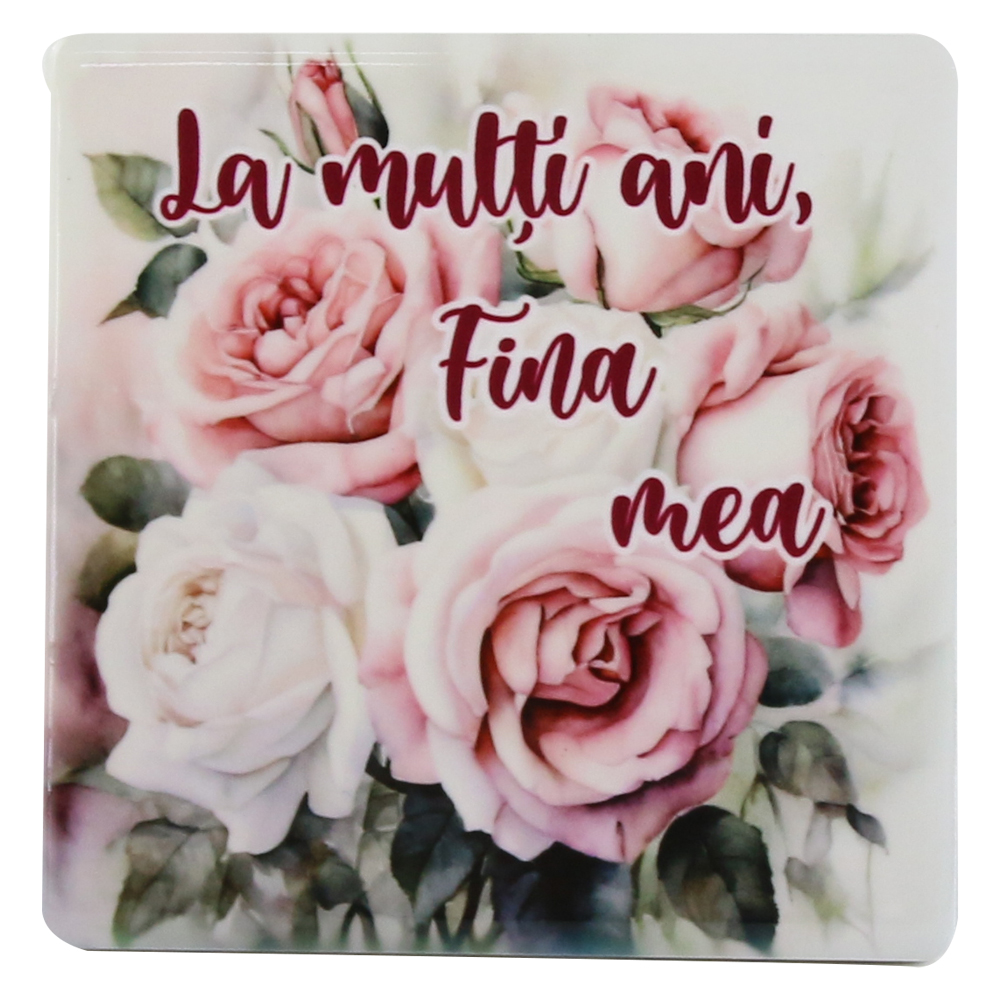 Magnet din ceramica „La multi ani, Fina mea!”, 7.5×7.5 CM, trandafiri
