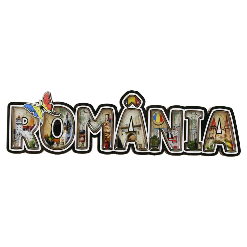 Magnet frigider din lemn 14×4 CM, Romania, cu fluture tricolor