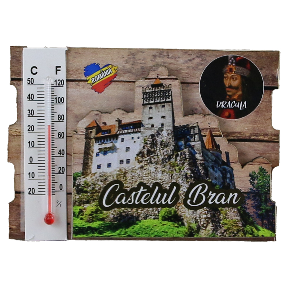 Magnet frigider din lemn „Castelul Bran” 9×6.5 CM, cu termometru