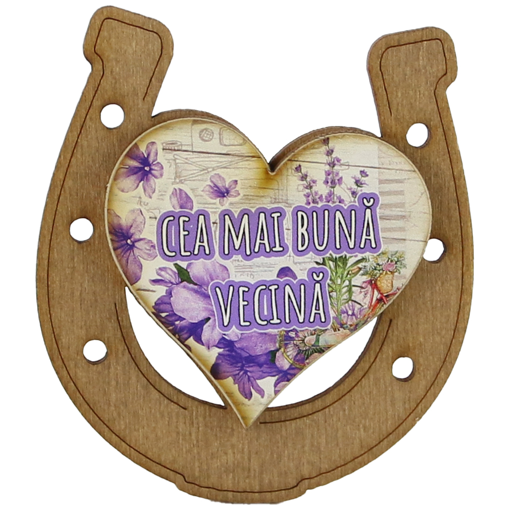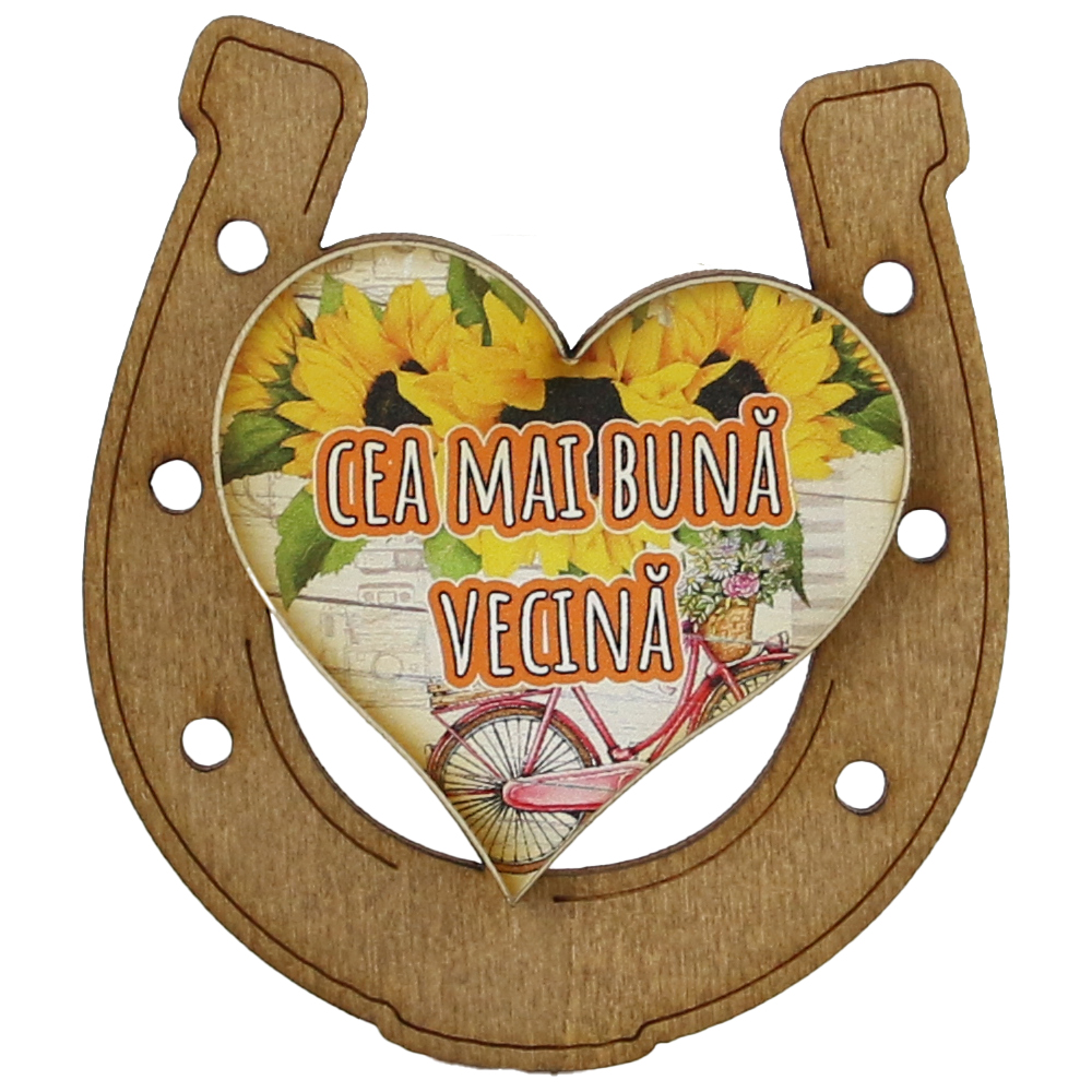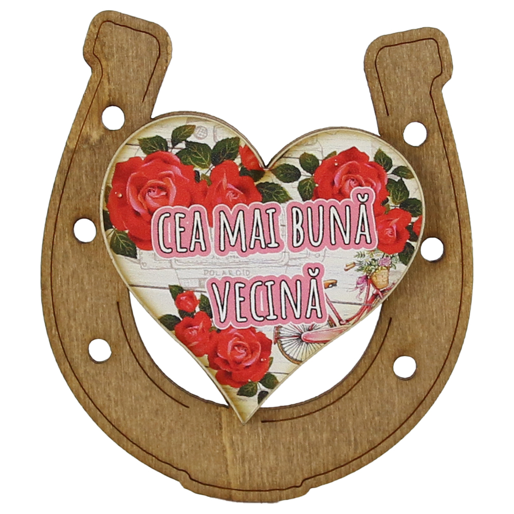 Magnet frigider din lemn „Cea mai buna Vecina” 7×8 CM, Potcoava