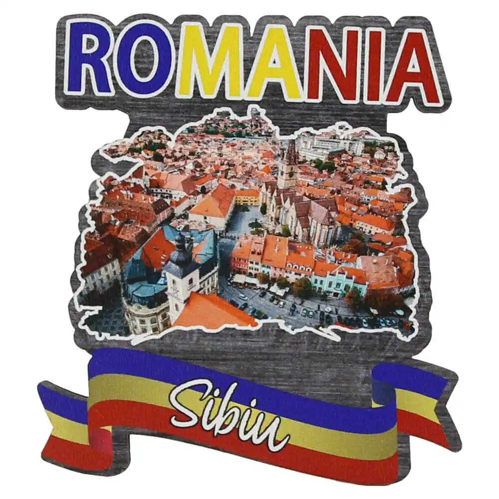 Magnet frigider din lemn „Romania” 8×8 CM, Sibiu, tricolor