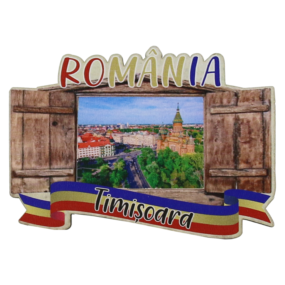Magnet frigider din lemn „Romania” 9×6.5 CM, Timisoara, fereastra