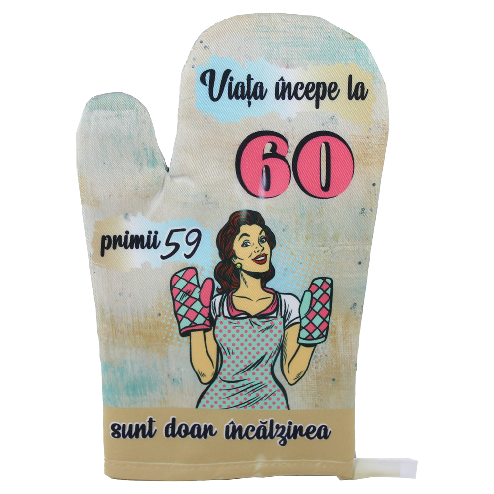 Manusa de bucatarie „Viata incepe la 60 …”, din textil, 27 CM