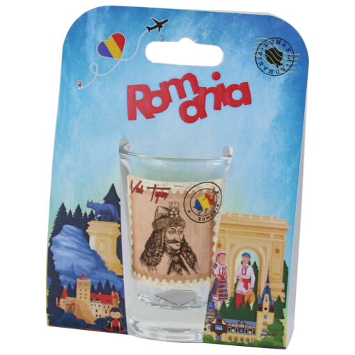 Pahar shot din sticla „Romania”, Vlad Tepes, in ambalaj decorativ