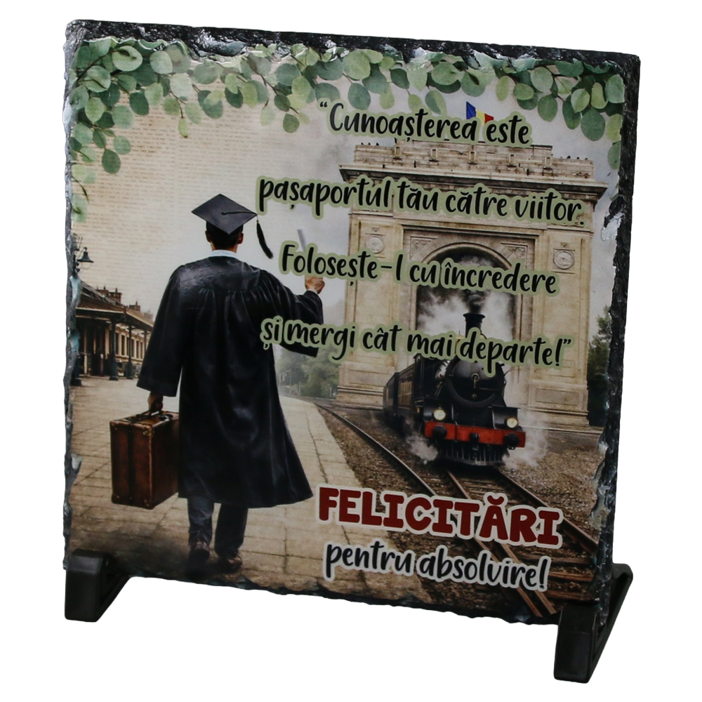 Placa ardezie „Cunoasterea este pasaportul tau…Felicitari pentru Absolvire!” 19 x 19 cm