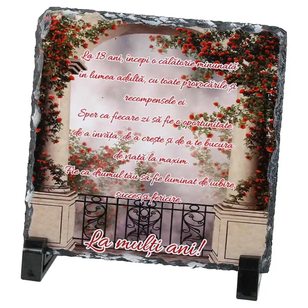 Placa ardezie „La 18 ani…La multi ani!” 14×14 CM, Roz