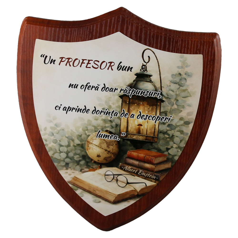 Placheta scut din lemn „Un Profesor bun nu ofera doar raspunsuri…” 22 x 26 cm