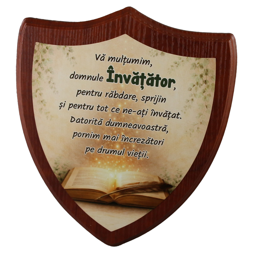 Placheta scut din lemn „Va multumim domnule Invatator…” 22 x 26 cm