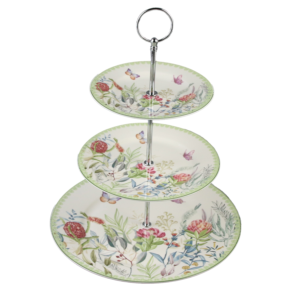 Acest platou etajat cu trei nivele este realizat din ceramica, avand un design cu flori, este ideal pentru a expune prajituri si dulcuri pentru evenimente, un platou elegant care este de nelipsit de pe masa festiva, totodata putand fi si un cadou perfect