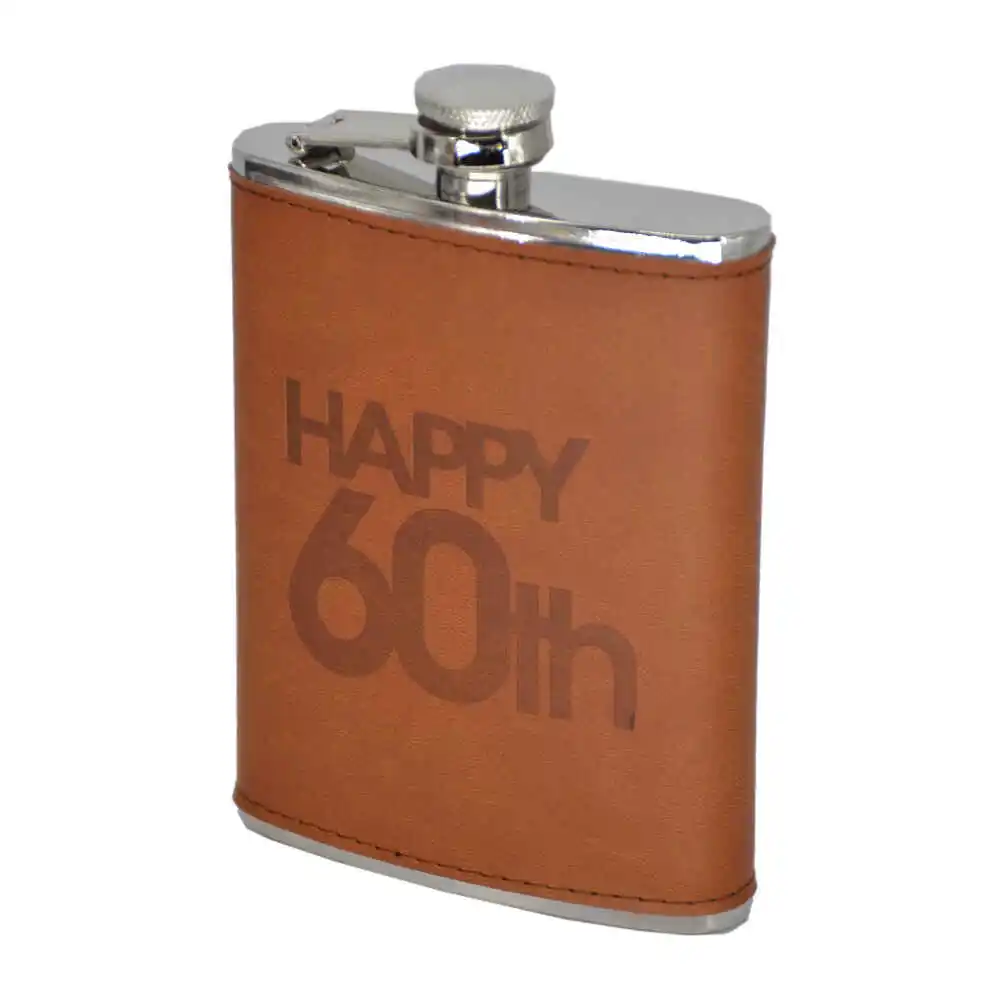 Aceasta plosca realizata din inox. cu husa confectionata din piele si un design special. poate fi cadoul ideal pentru orice barbat la aniversarea de 60 de ani.