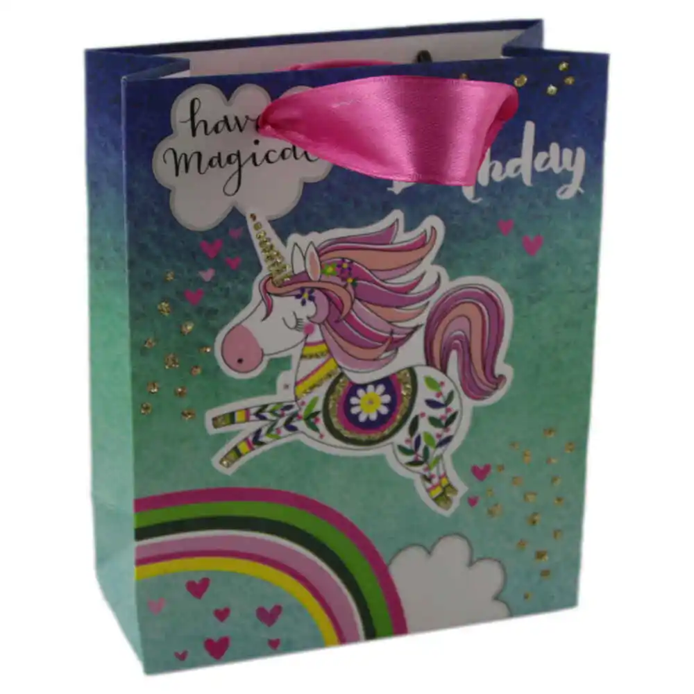 Aceasta punga pentru cadouri este realizata din hartie rezistenta,ideala pentru a surprinde pe cei dragi cu ocazia evenimentelor sau sarbatorilor cu cadouri unice. Punga are un design cu unicorn si inscriptia „Have a magical birthday” si dispune de manere