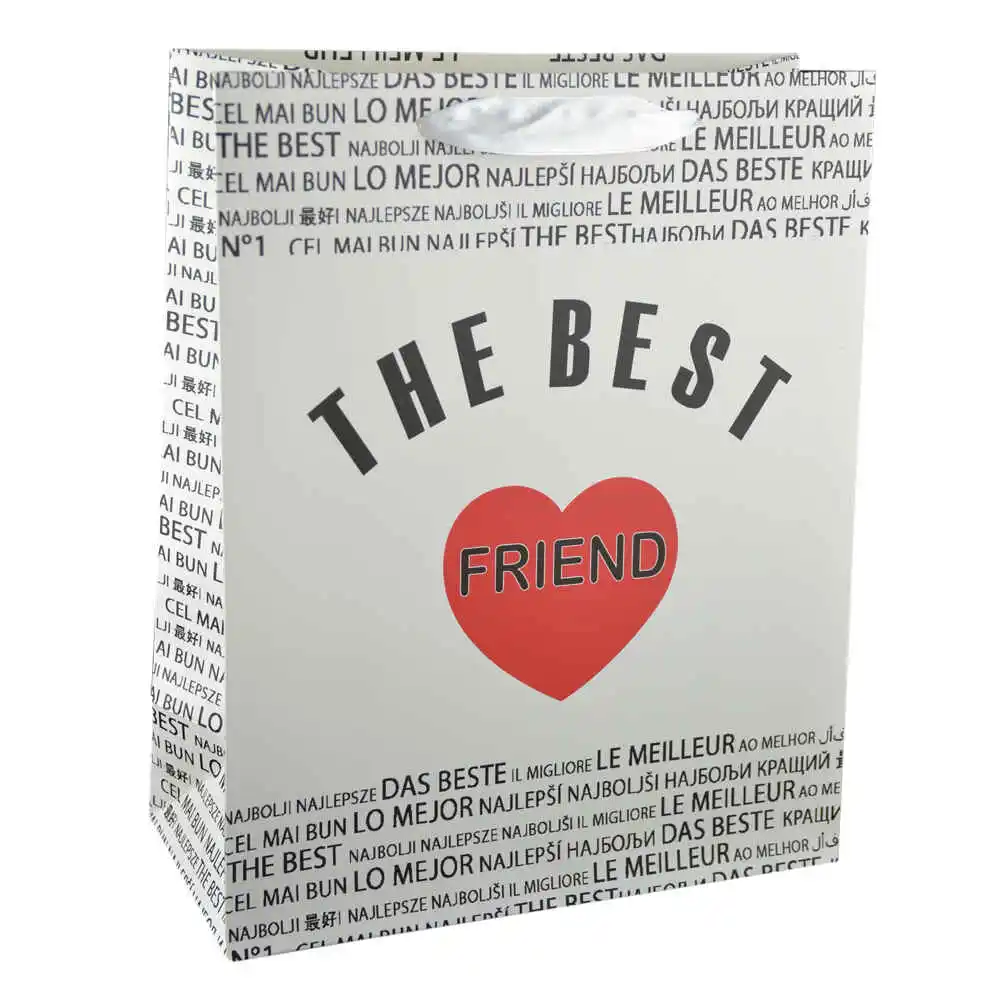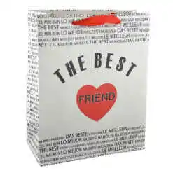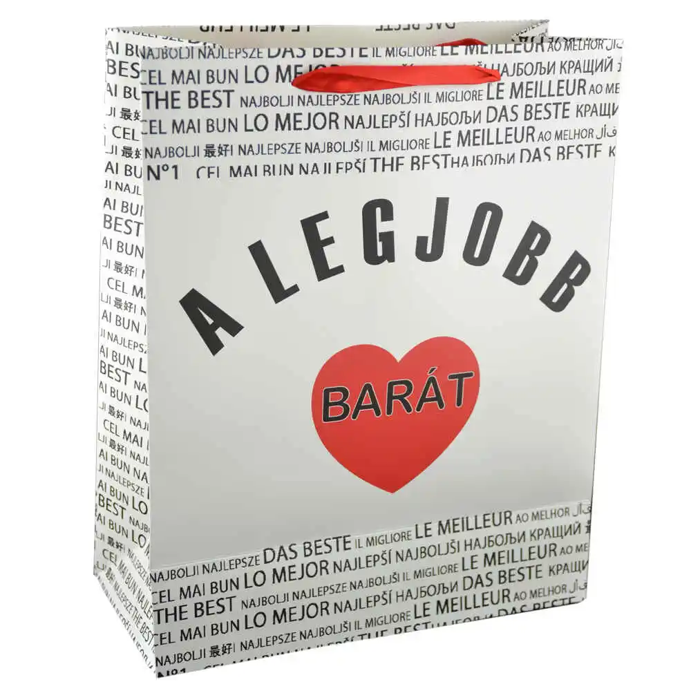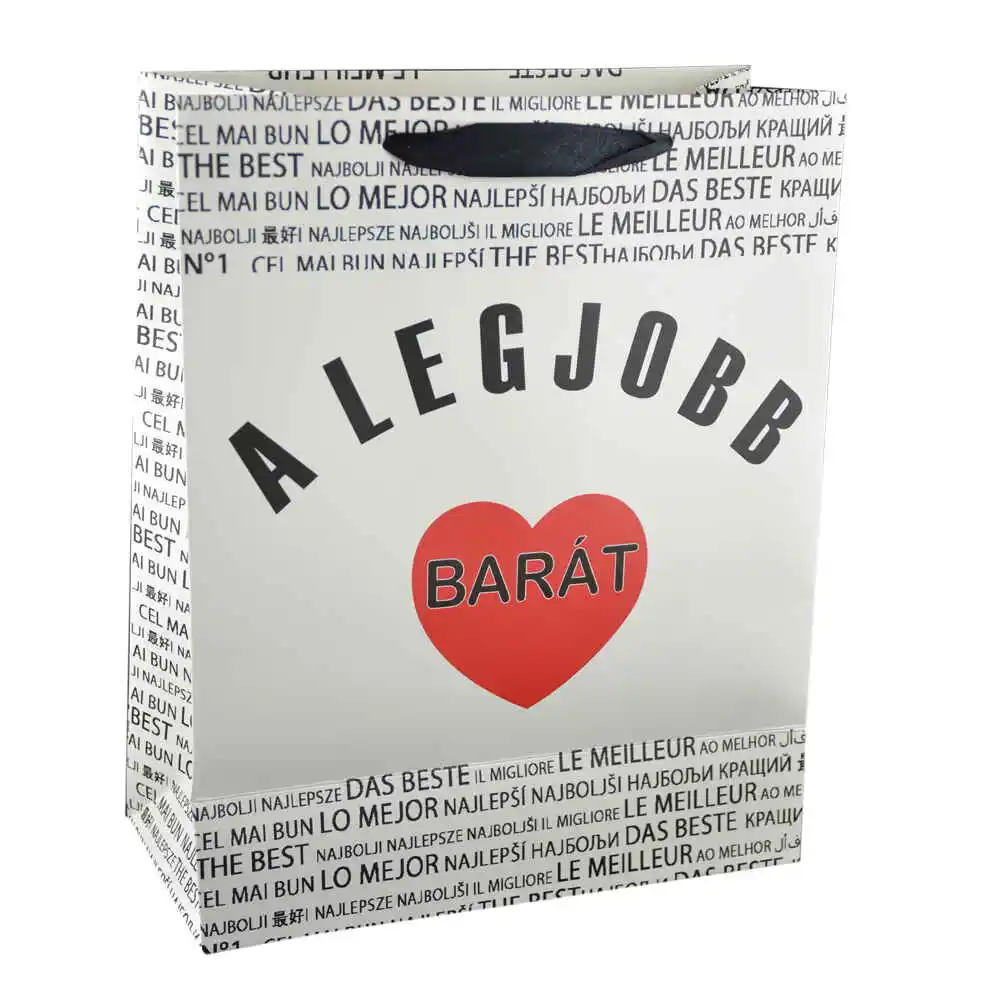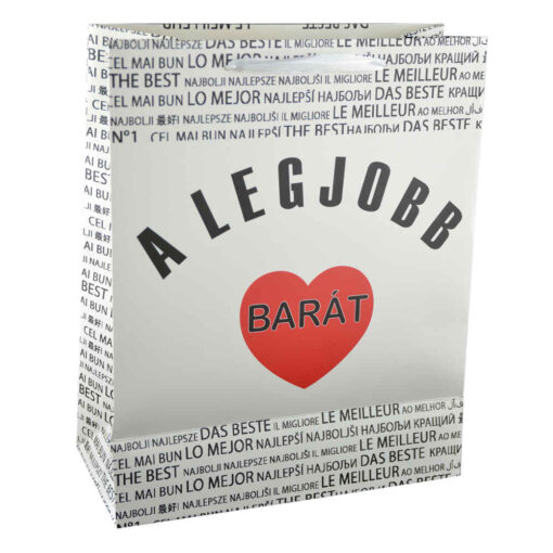 Aceasta punga pentru cadouri realizata din hartie rezistenta este ideala pentru a-l surprinde pe prietenul dumneavoastra cel mai bun cu diferite cadouri. Punga inscriptionata cu textul „A legjobb barat/The best friend” si decorata cu inimioara. va insufla