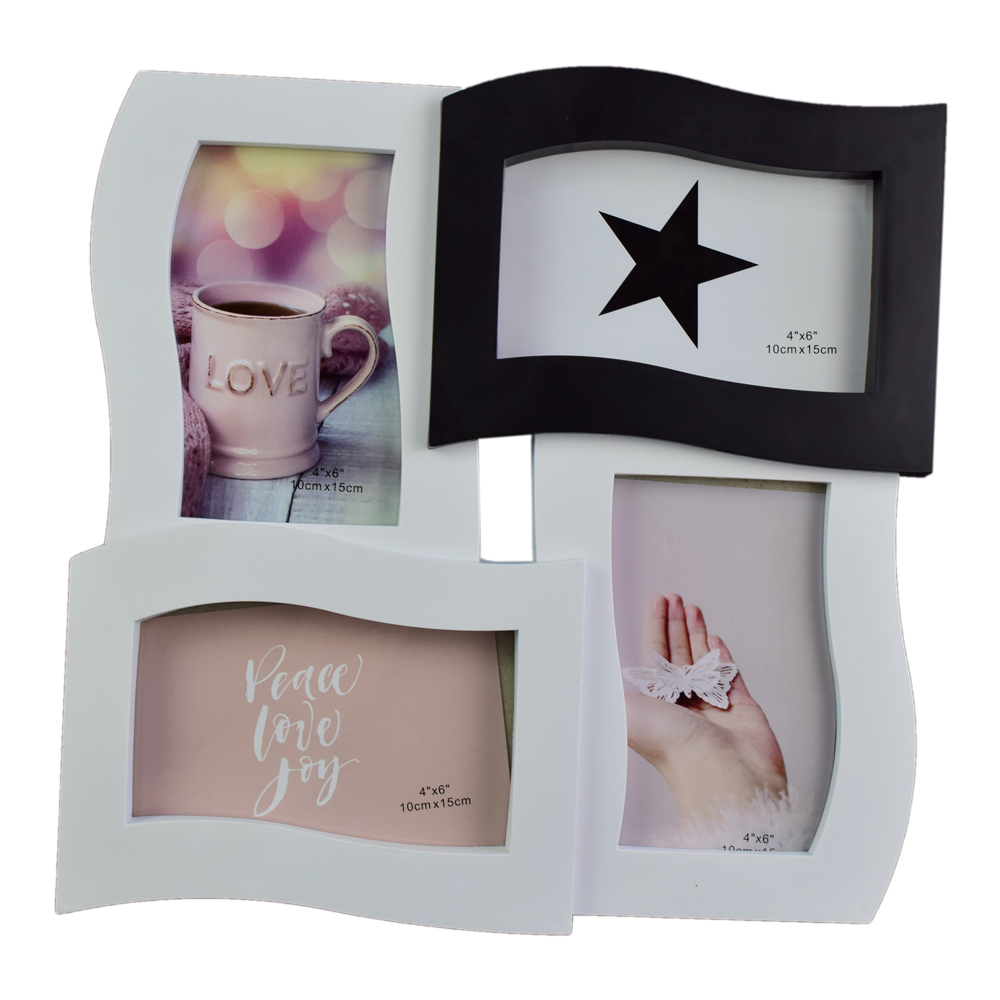 Respectiva rama pentru fotografii este realizata din plastic. este ideala pentru a face parte din decoratiunea locuintei. deoarece cu ajutorul acesteia veti putea expune cele mai frumoase aminitri din viata. Cele patru rame sunt atasate una de cealalta.