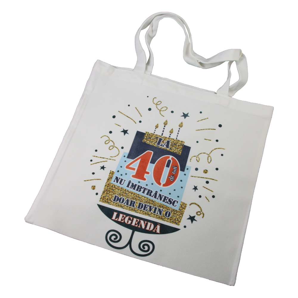 Sacosa textil „La 40 de ani nu imbatranesc, …”, 40×40 CM, tort