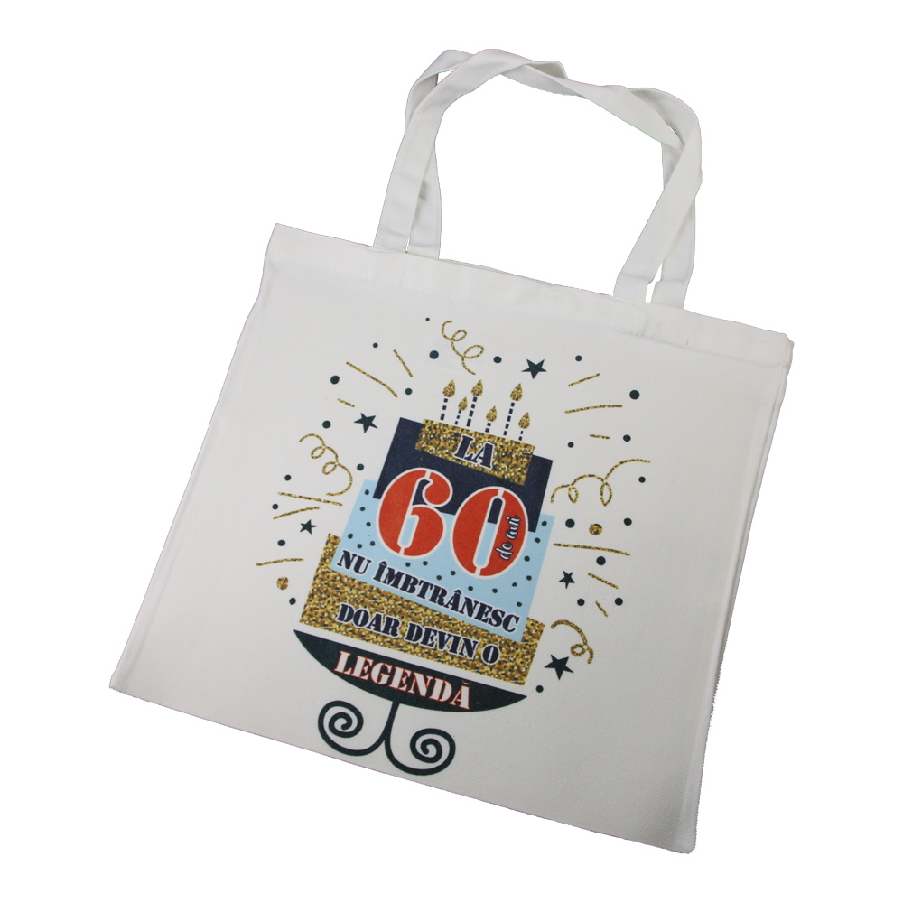 Sacosa textil „La 60 de ani nu imbatranesc, …”, 40×40 CM, tort