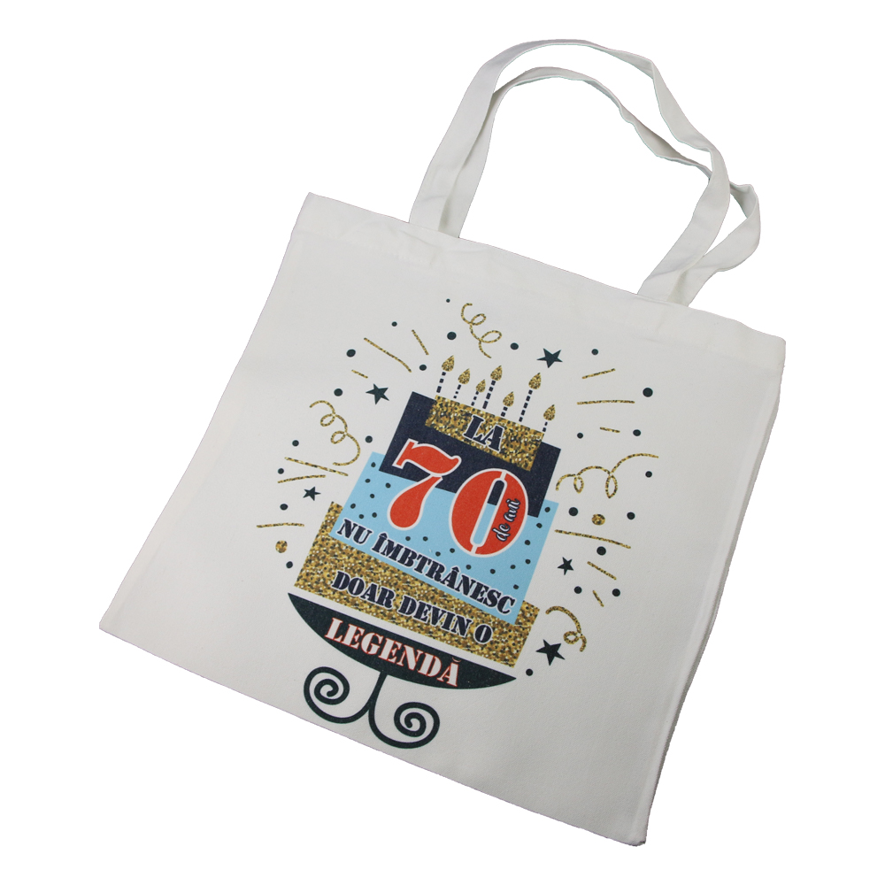Sacosa textil „La 70 de ani nu imbatranesc, …”, 40×40 CM, tort