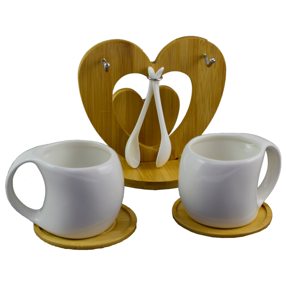 Respectivul set este format din doua cani si doua lingurite realizate din portelan, un suport din bambus in forma de inimioara pe care se pot agata articolele si doua suporturi pentru masa. Setul poate fi un cadou potrivit celor dragi, avand si un rol dec