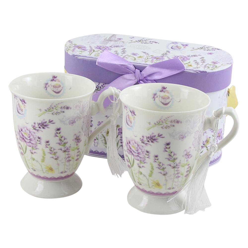 Set 2 cani din ceramica 300 ml, Lavanda flowers, cu franjuri, in cutie decorativa