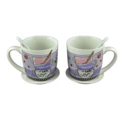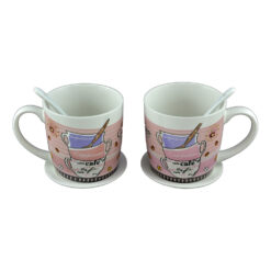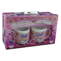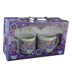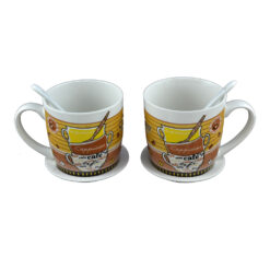 Acest set realizat din ceramica. avand un design cu tema „Coffee”. este format din doua cani. fiecare fiind dotata cu cate o lingurita si o farfurie/un capac datorita caruia bautura preferata se mentine calda pe un timp indelungat. Este ideal pentru a savura o cafea sau un ceai in diminetile racoroasa si somnoroase. sau pentru a se bucura de bautura favorita cu familia sau prieteni. Deasemenea. poate fi un cadou perfect pentru cei dragi. fiind intr-o cutie de carton cu aceasi design.