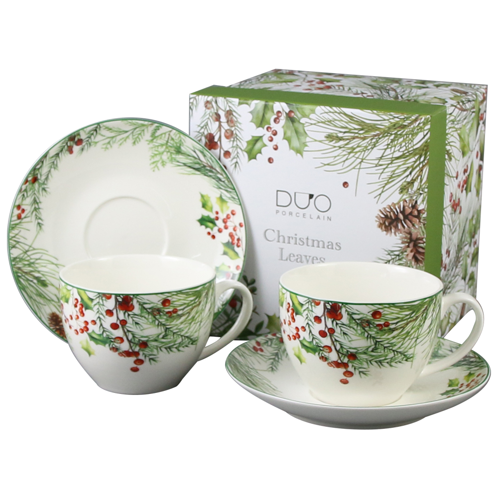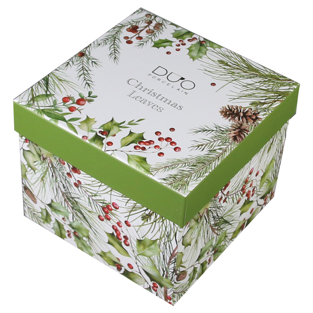 Set 2 cesti cu farfurii, din portelan, Christmas Leaves, 270 ml, in cutie decorativa, Frunze de Craciun