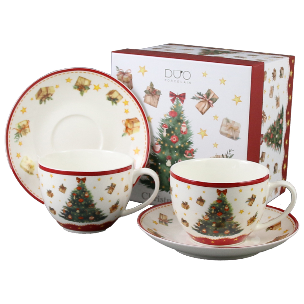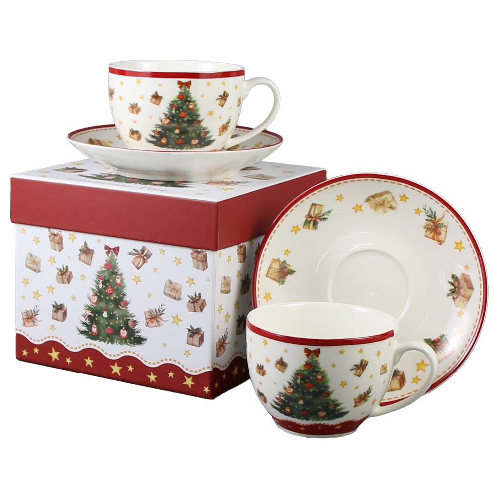 Set 2 cesti cu farfurii, din portelan, Christmas Tree, 270 ml, in cutie decorativa, Brad de Craciun