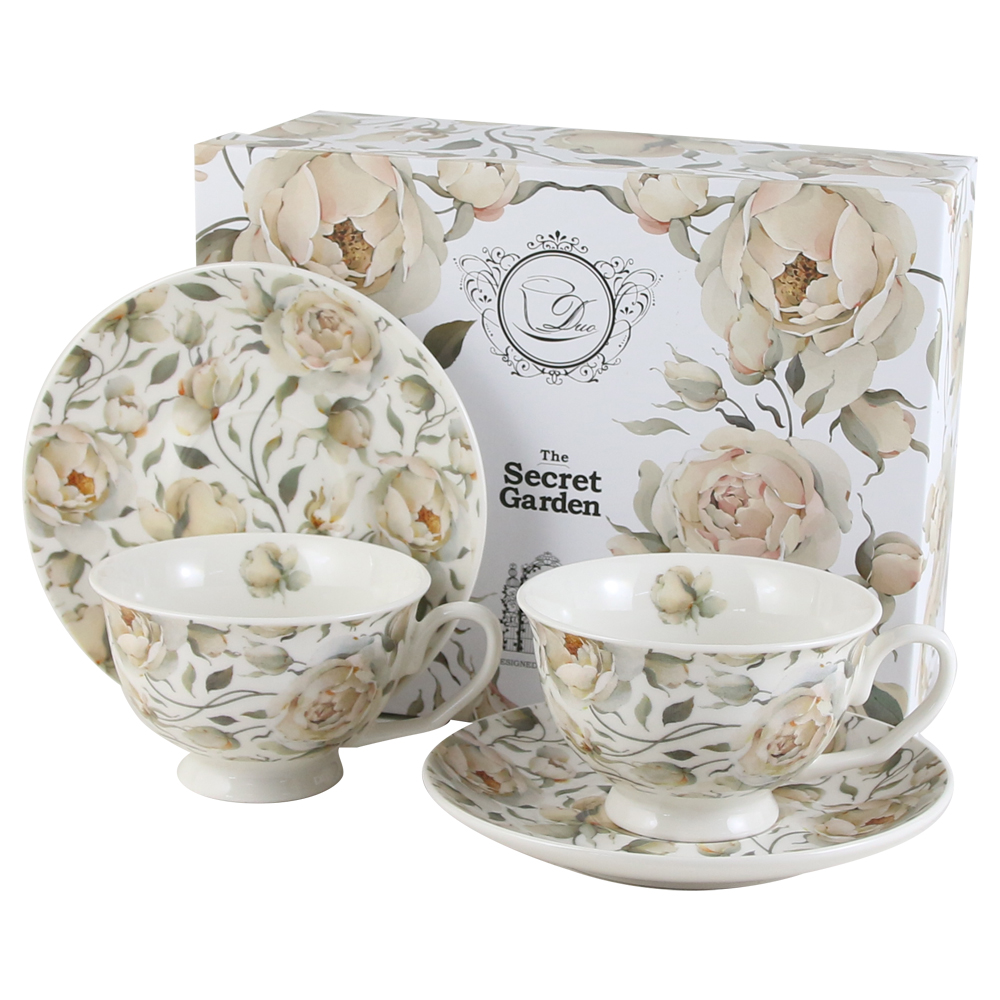 Set 2 cesti cu farfurii, din portelan „English Roses White”, 250 ml, in cutie decorativa