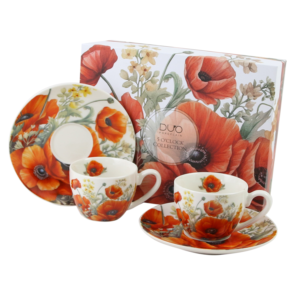Set 2 cesti espresso cu farfurii, din portelan 110 ml, „Poppies”, in cutie decorativa