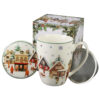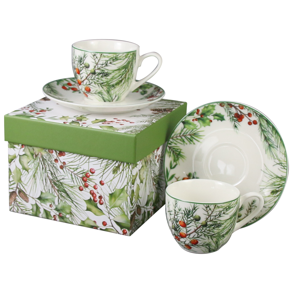 Set 2 cesti espresso cu farfurii, din portelan, Christmas Leaves, 90 ml, in cutie decorativa, Frunze de Craciun