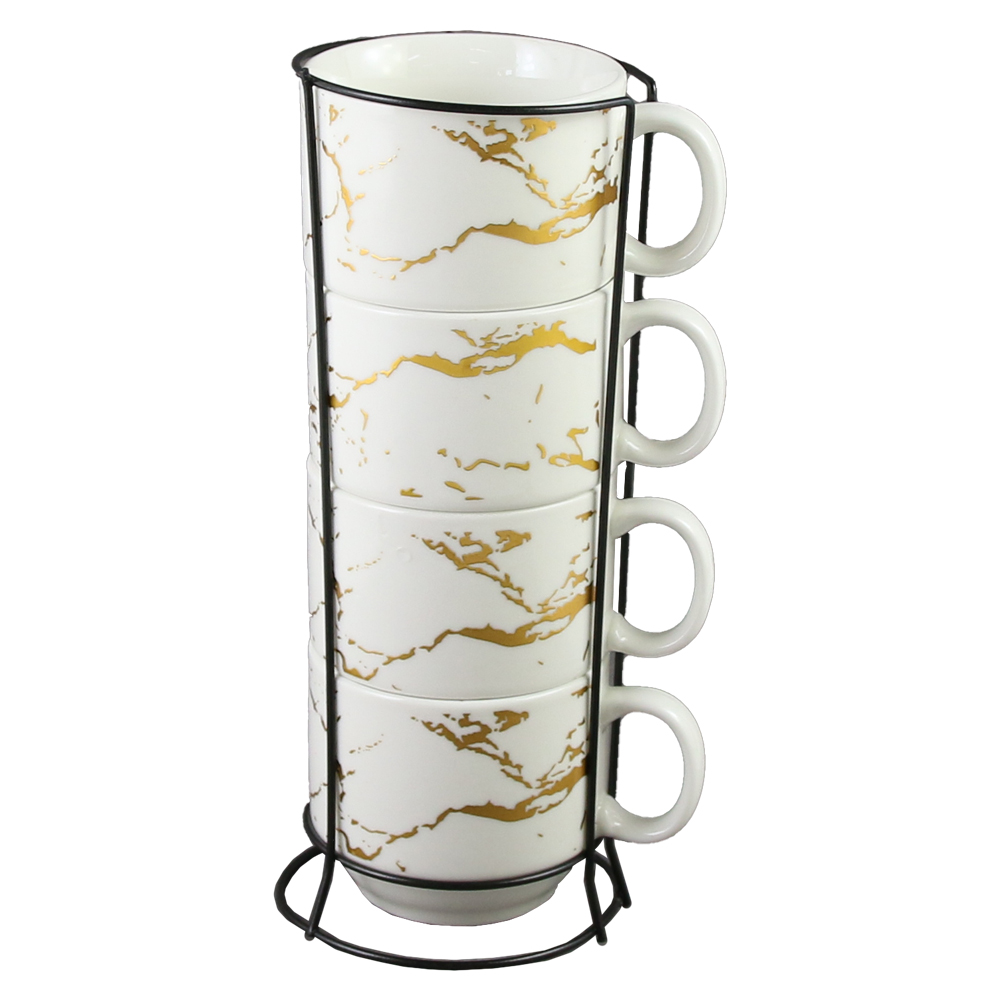 Set 4 cesti din ceramica cu suport metalic, 150 ml, Alb & auriu